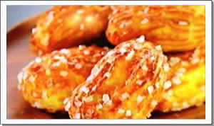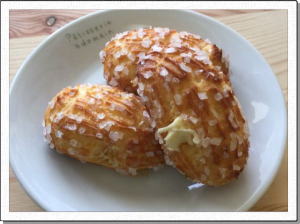 ミニヨンシューは、シュークリームには珍しい俵型をしていて、表面にザラメをのせて焼いてあるのが、最大の特徴です。