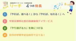 奈良県北葛城郡河合町の放課後等デイサービス・児童発達支援「リーチ」は、河合町、王寺町、斑鳩町、三郷町、広陵町、上牧町にお住いの知的障がい、発達障がいをお持ちのお子さまたちを対象に学習支援特化型の放課後等デイサービスになります。予定の計画や学習する目的など、さまざまな角度から子どもたちと学習等に関り、子どもたちの将来に必要な支援を行います。